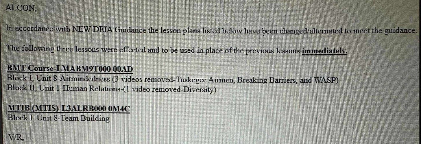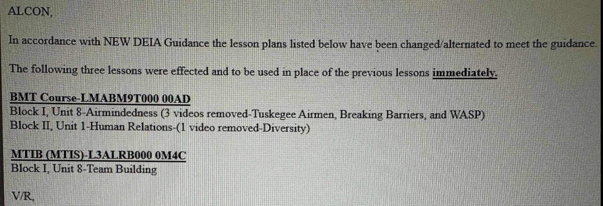The outlet reported that the videos were used in DEI training courses at Joint Base San Antonio-Lackland, where new Air Force recruits undergo basic training. The removal of the videos was seen as an attempt by the Air Force to comply with a recent edict ordering the cancellation and removal of all DEI and DEI-related content and training.