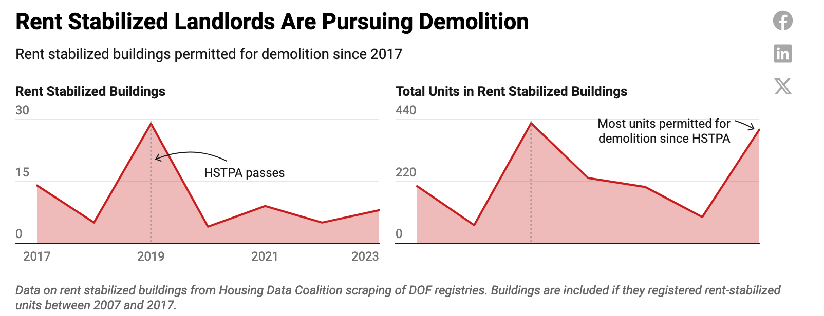 Today, demolition is one of the only ways to definitively wipe out a building’s regulated status. The 2019 rent laws narrowed the path for co-op and condominium conversion, and increased scrutiny on the “substantial rehabilitation” route, which requires replacing most of a building’s systems.