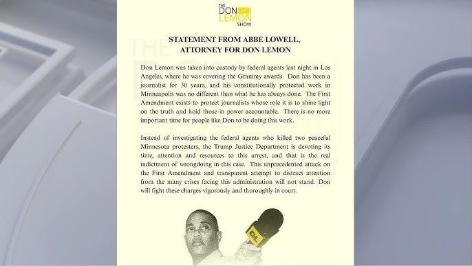 “Don has been a journalist for 30 years, and his constitutionally protected work in Minneapolis was no different than what he has always done. The First Amendment exists to protect journalists whose role it is to shine light on the truth and hold those in power accountable. There is no more important time for people like Don to be doing this work,” Lemon’s attorney said in a statement.