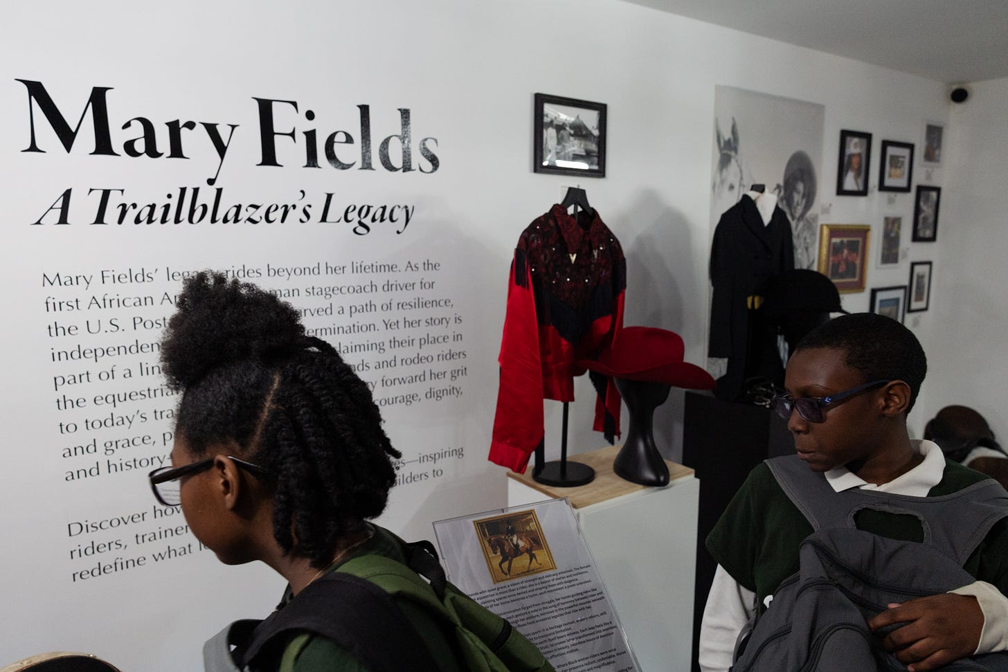 Curated by Levi Robinson, the 1,400-square-foot museum presents the triumphs, losses and ties that bind Black communities to horse culture. In the center of a large room with walls covered in old western artifacts, interactive digital screens, paintings and photos is a life-sized statue of Fields standing beside a horse and carriage.