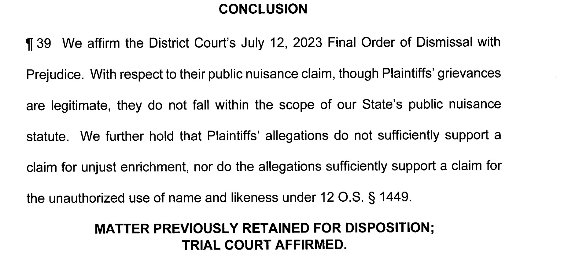 “With respect to their public nuisance claim, though Plaintiffs' grievances are legitimate, they do not fall within the scope of our State's public nuisance statute,” the conclusion reads.