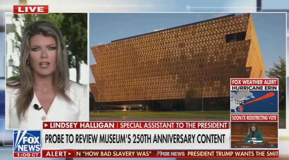 Lindsey Halligan appeared on Fox News on Wednesday to defend Trump’s recent attacks on the Smithsonian, which he called “OUT OF CONTROL” for pointing out “how bad Slavery was.”